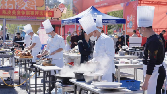 比赛现场热气蒸腾,陈皮醇香交织着食材本味,切菜声、锅勺碰撞声此起彼伏。在煎、炸、蒸、煮的百般技艺下,大厨们各显神通,将醇厚陈香的陈皮化作一道道色香味俱全的创意佳肴。